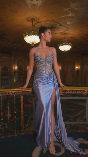 Crafted for the spotlight, this fitted evening gown radiates luxury with a sweetheart neckline and sheer corset bodice adorned in glistening beaded embellishments. The satin draped skirt hugs the silhouette, falling into a sultry high leg slit that adds movement and drama. Complete with a glamorous side sash, this gown is the ultimate choice for prom, red carpet moments, or any unforgettable formal occasion.