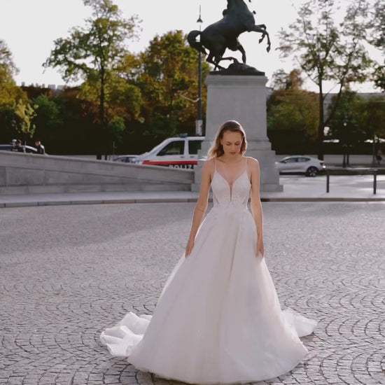 This magical gown belongs to a fairytale realm. With its fitted bodice and dramatically flared skirt, it’s no wonder that many ladies dream of wearing this dress on their special day. Ball Gown Wedding Dresses are a stunning choice for most brides, but they can overwhelm a petite frame. Shown in Nude mesh on the sides of the bodice and illuminated skirt, nude cups, small nude insert at the neckline, approximately 100 cm train.