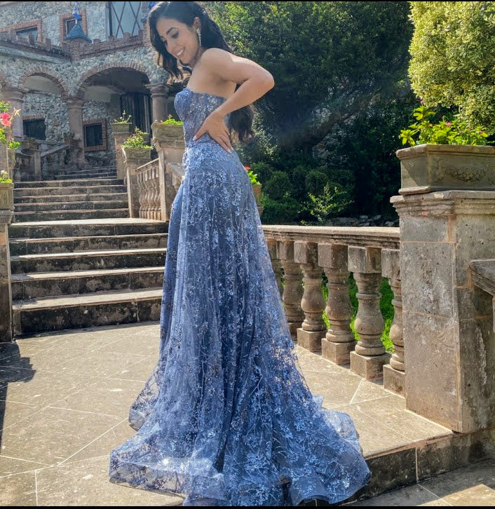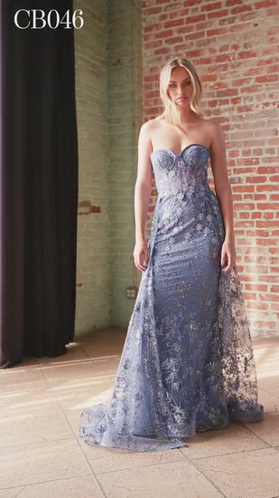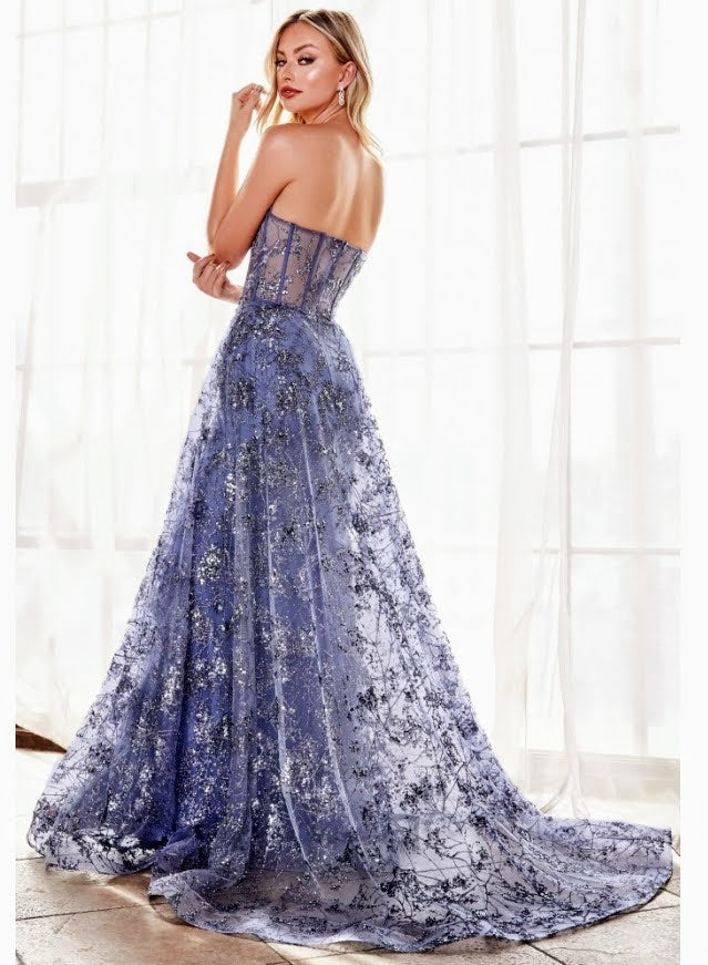 Glitter Fitted Gown and Overskirt. Floral print Corset Top and strapless.
