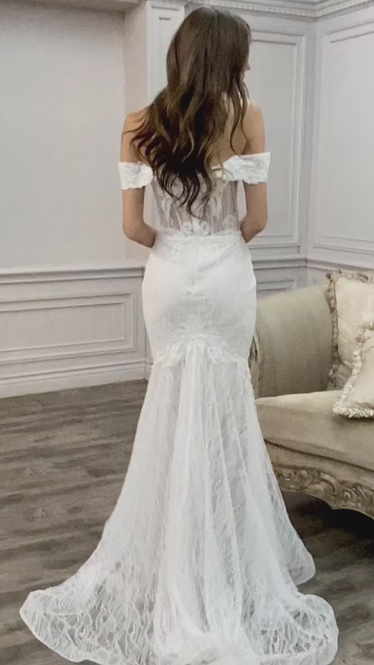 Jolie Gown is everything a bride could want: Beautiful lace placement that falls flatteringly on the body, perfect mermaid silhouette, and comfortable stretch. Off shoulder lace flap provides elegant cover to the arms while showcasing a beautiful neckline. There is no compromise in the beauty of the gown, as this dress makes perfect hourglass of the wearer.