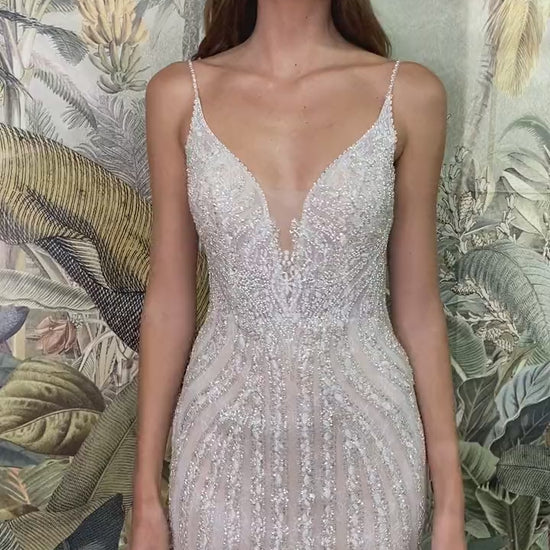 This impeccably crafted gown will accentuate your hourglass shape with a dramatic floor-sweeping mermaid skirt. Sheer layered tulle and chantilly lace is embellished with beading that shimmers as you move. The dress features a deep illusion v-neckline that turns to reveal a low open back, delicately suspended by beaded spaghetti straps. The dress is lined with stretch lining for the wearer's comfort.